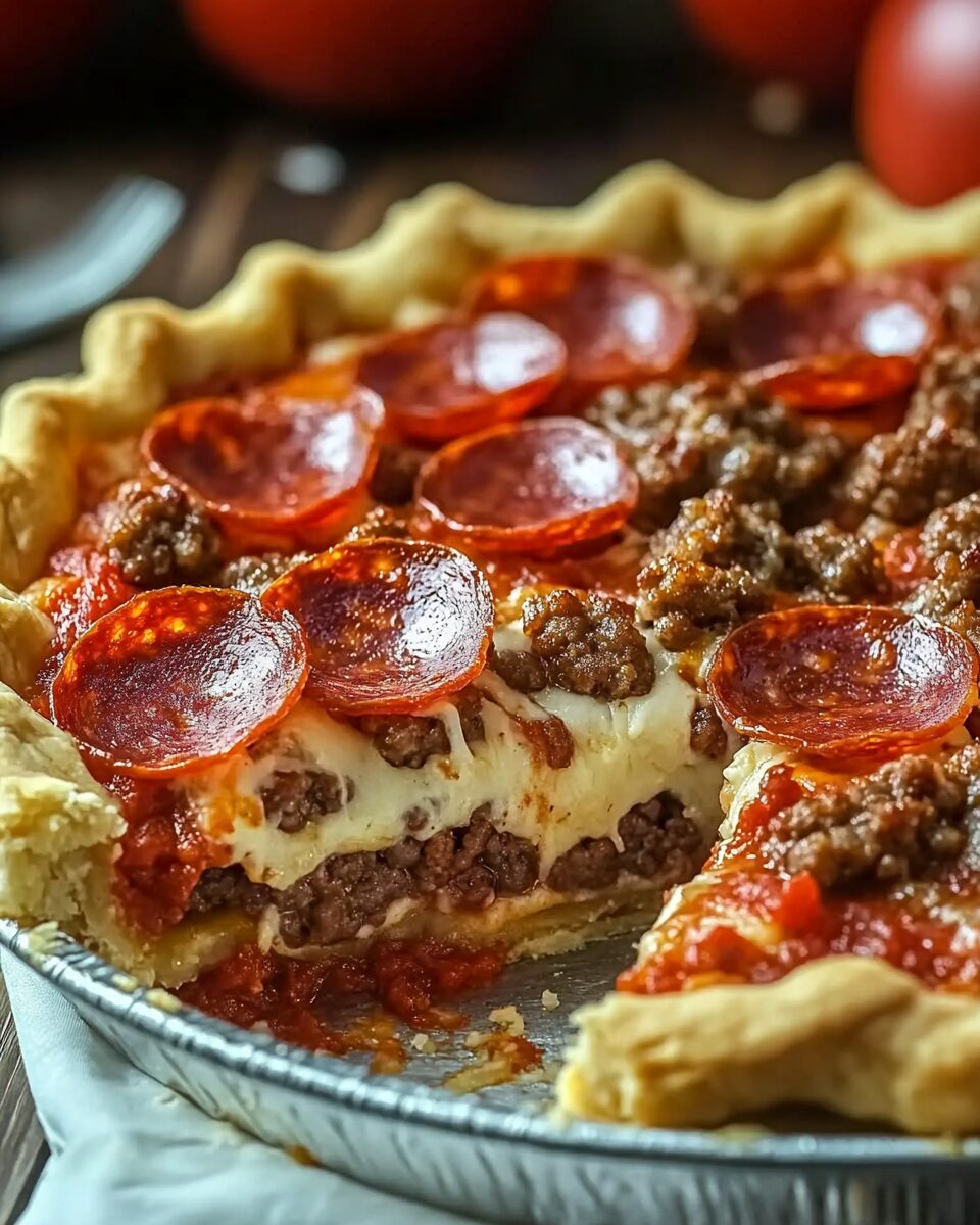 This dish is inspired by classic Italian-American comfort food, drawing from the deep-dish pizza traditions of Chicago and the savory pie styles found throughout southern cuisine. It’s a nod to the way American kitchens embrace fusion—taking the familiar elements of a pizza and reimagining them into a pie form.